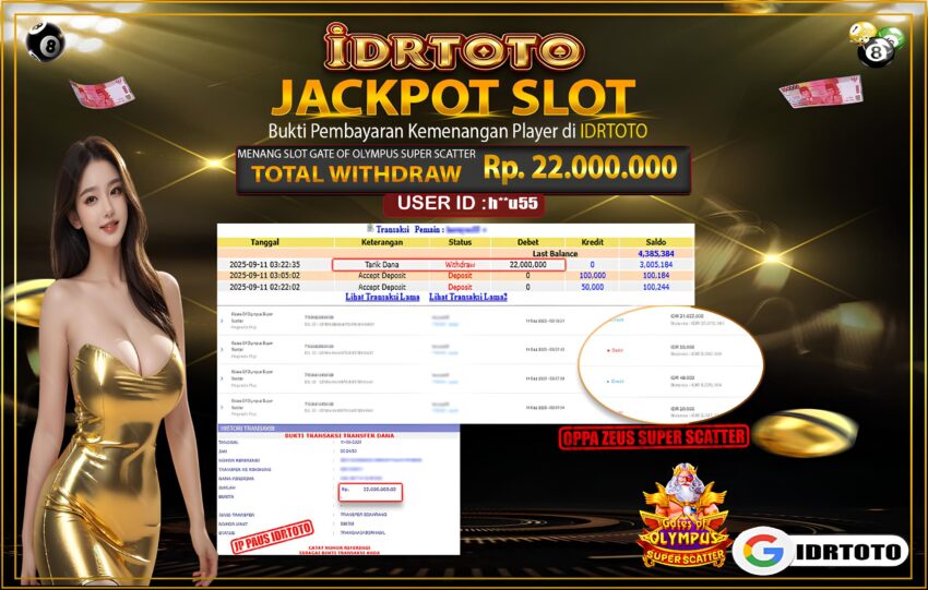IDRTOTO BAYAR LUNAS JACKPOT PERMAINAN GATES OF OLYMPUS SUPER SCATTER Rp.22.000.,000 – LUNAS