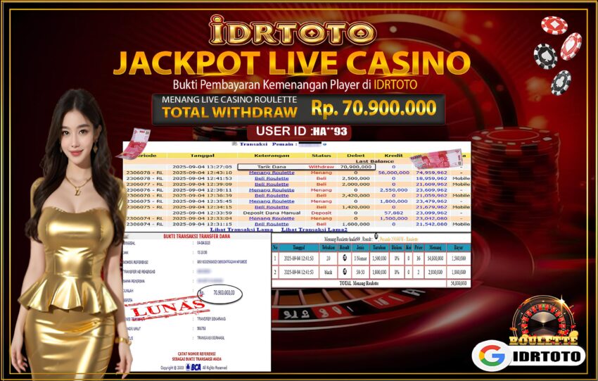 IDRTOTO BAYAR LUNAS JACKPOT PERMAINAN LIVE CASINO ROULETTE Rp.70.900.,000 – LUNAS