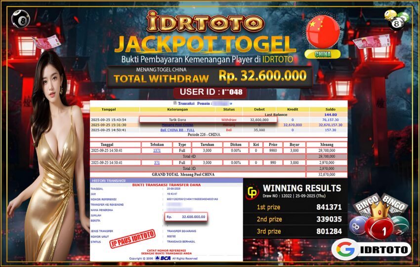 IDRTOTO BAYAR LUNAS JACKPOT PERMAINAN TOGEL CHINA POOLS Rp.32.600.000 – LUNAS