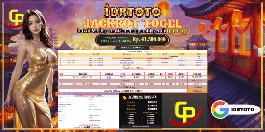 IDRTOTO BAYAR LUNAS JACKPOT PERMAINAN TOGEL CHINA POOLS Rp.41.580.000 – LUNAS