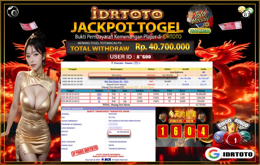 IDRTOTO BAYAR LUNAS JACKPOT PERMAINAN TOGEL TOTO MACAU P4 Rp.40.700.000 – LUNAS