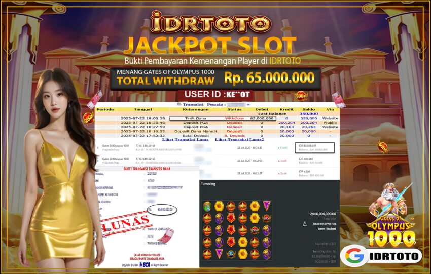 IDRTOTO BAYAR LUNAS JACKPOT SLOT GATES OF OLYMPUS 1000 Rp.65.000.,000 – LUNAS
