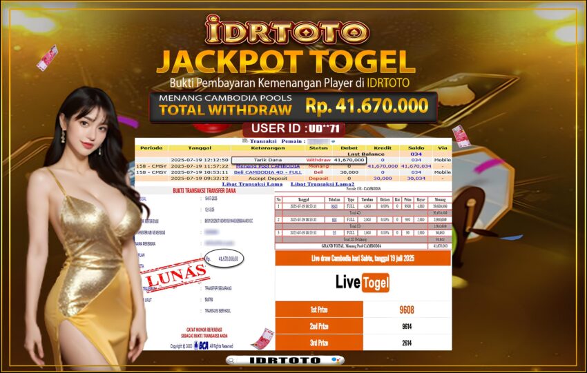 IDRTOTO BAYAR LUNAS JACKPOT TOGEL CAMBODIA POOLS Rp.41.670.,000 – LUNAS