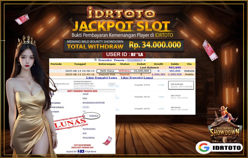 Dengan kemenangan Sebesar Rp.34.000.000- Setelah mengisi formulir withdraw dengan kurung waktu hanya 3-5 menit pihak IDRTOTO sudah melakukan transfer kepada pemilik User id dan dana sudah dapat di cairkan oleh pemenang. Dengan demikian, Bukti pembayaran yang kami berikan merupakan bukti pembayaran yang SAH / VALID yang langung di dapatkan melaui transfer transaksi dari Bank yang terdaftar.