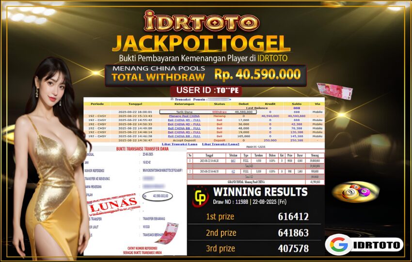 IDRTOTO BAYAR LUNAS TOGEL CHINA POOLS Rp.40.590.,000 – LUNAS